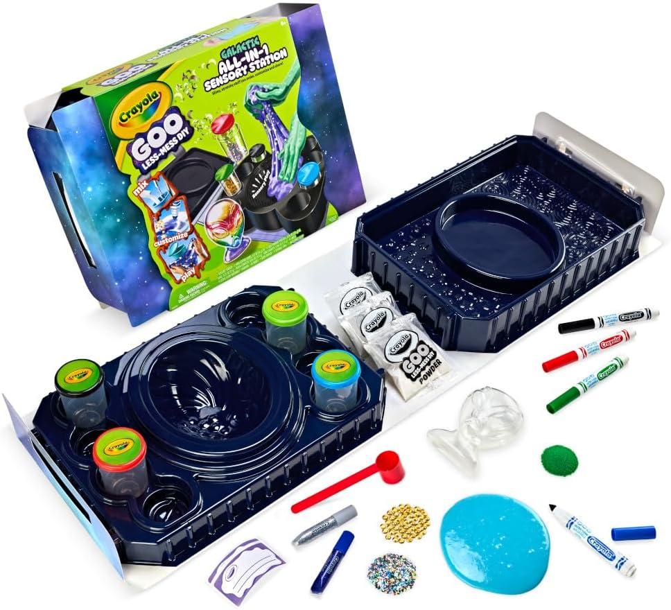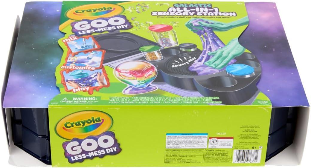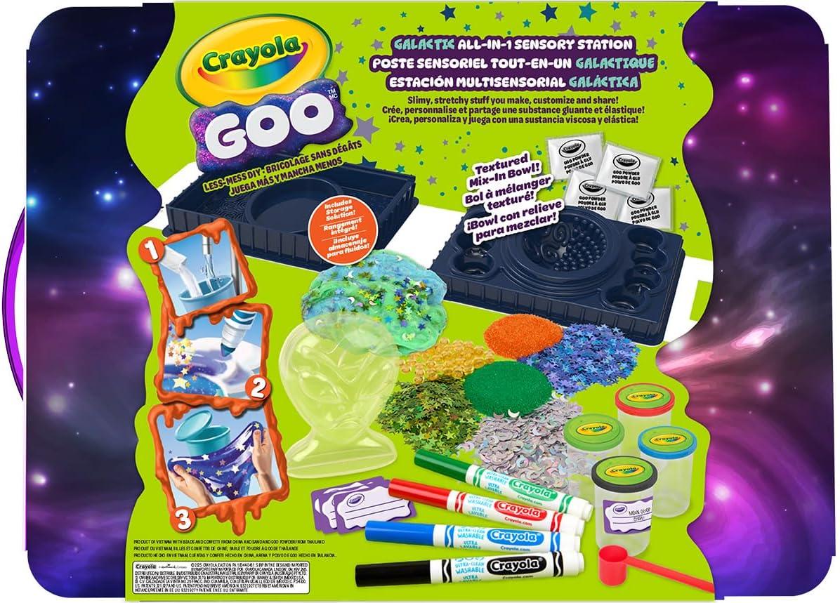 CRAYOLA GOO GALACTIC SENSORY STATION: Includes 1 sensory goo station, 4 white Goo powders, 4 mix-ins (moon confetti, star confetti, sand, fishbowl beads), 2 mini glitter glues, 1 alien slime display, 4 Mini Goo cups with lids, 4 labels, 4 ultra-clean washable markers, and 1 measuring scoop.
