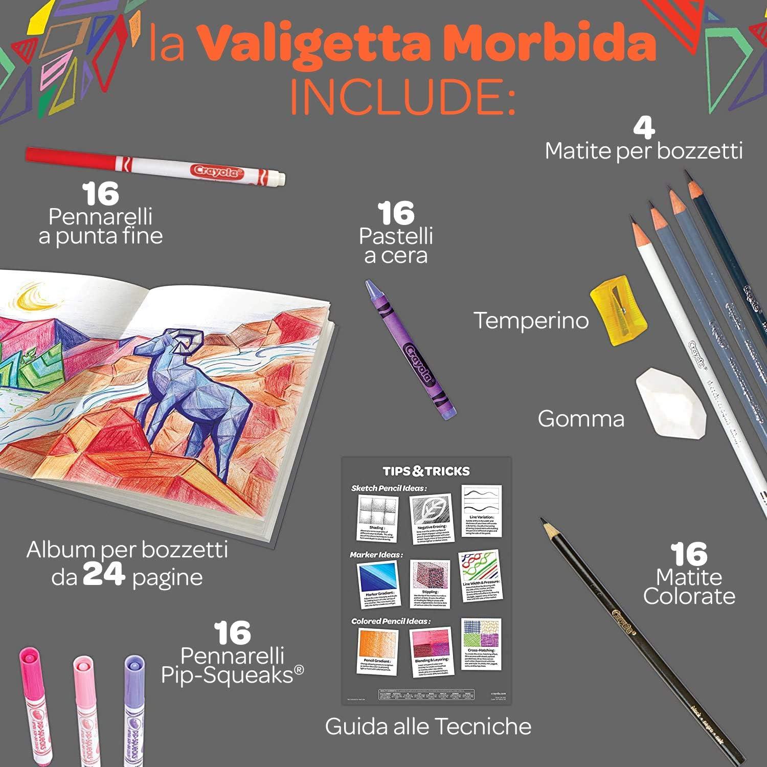 SKETCHING ART SET: Features over 85 Pieces in a Soft Case, including 16 Crayons, 16 Colored Pencils, 4 Sketch Pencils, 16 Fine Line Markers, 16 Pip Squeaks Skinnies Markers, 1 Sharpener, 1 Easer, 24 Page Sketchbook, and How to Guide.