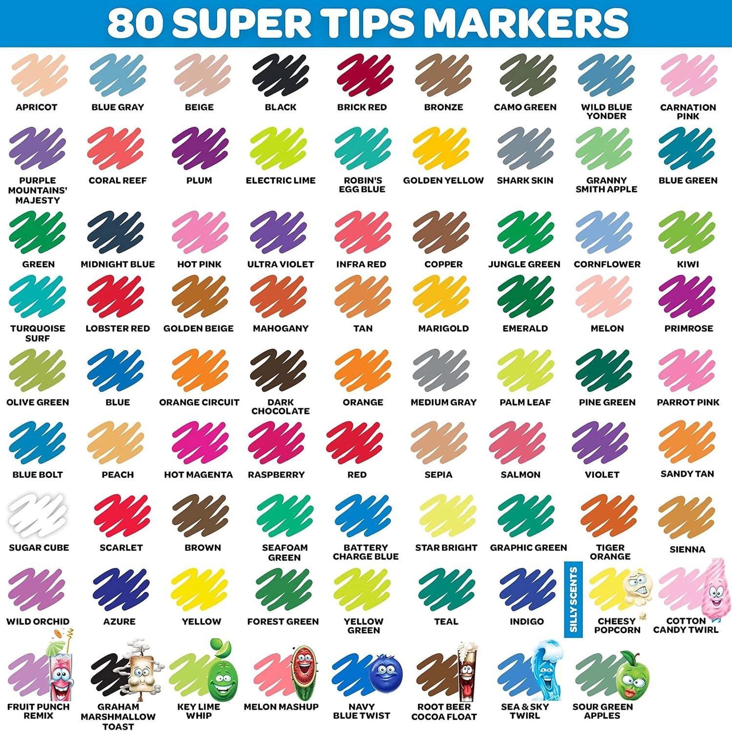 CRAYOLA SUPERTIPS MARKERS: Enjoy more variety with our 80 Crayola SuperTips washable markers, featuring 70 bold SuperTips colors, and 10 Scented Markers.